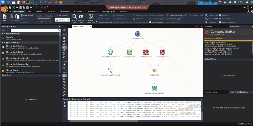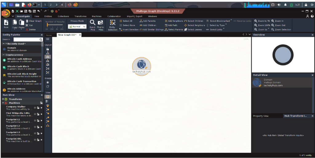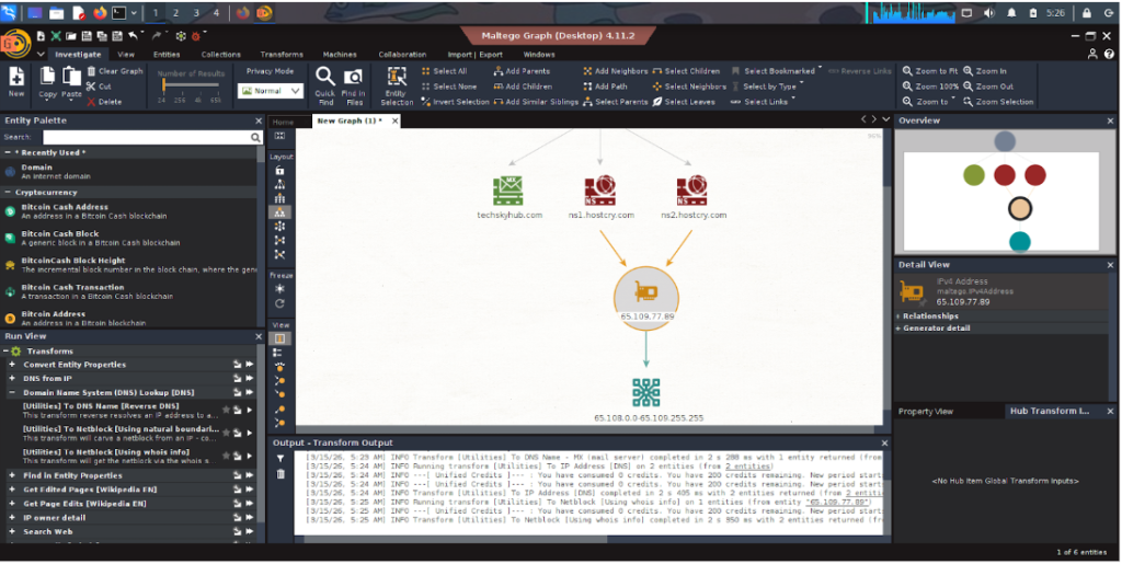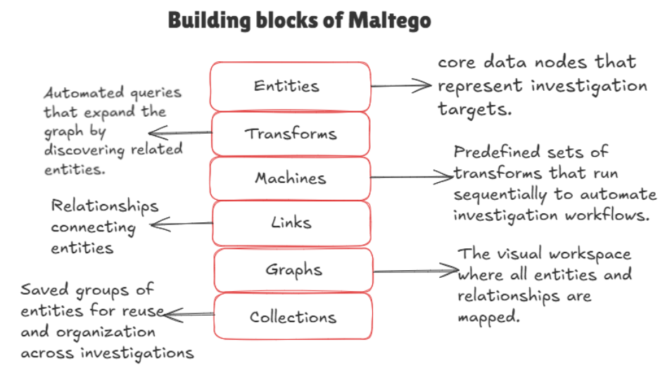 Maltego is an open source tool that allows us to mine and gather information and represent our findings in a meaningful way. We can look up domain names, the network block addresses associated with them, and MX records. With just a few clicks, we can identify key relationships between the objects we insert into our Graph views while Maltego does the data-mining work behind the scenes. Let’s understand the building blocks of Maltego as listed below