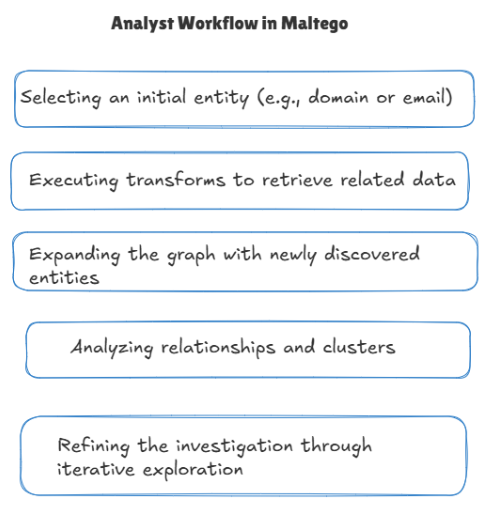 Maltego allows analysts to start with a seed entity (a domain or email) and uses transforms to automatically discover related entities such as IP addresses, infrastructure, and associated identities. The investigation is expanded iteratively, with the graph growing as new relationships are uncovered. Throughout the process, the analyst filters, correlates, and interprets connections to identify meaningful patterns and actionable intelligence.